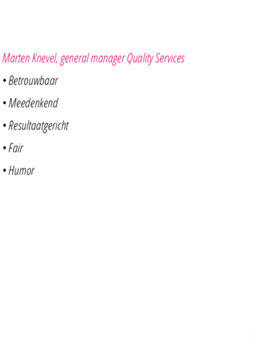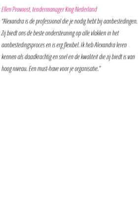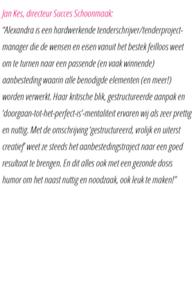 ‘Alexandra is een hardwerkende tenderschrijver/ tenderprojectmanager die de wensen en eisen vanuit het bestek feilloos weet om te turnen naar een passende (en vaak winnende) aanbesteding waarin alle benodigde elementen (en meer!) worden verwerkt. Haar kritische blik, gestructureerde aanpak en ‘doorgaan-tot-het-perfect-is’-mentaliteit ervaren wij als zeer prettig en nuttig. Met de omschrijving ‘gestructureerd, vrolijk en uiterst creatief’ weet ze steeds het aanbestedingstraject naar een goed resultaat te brengen. En dit alles ook met een gezonde dosis humor om het naast nuttig en noodzaak, ook leuk te maken!’