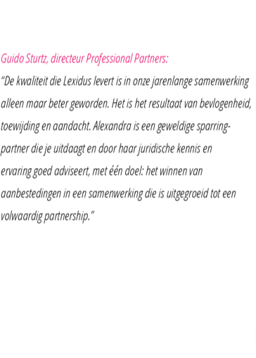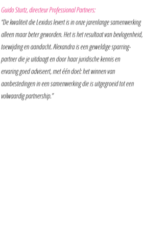 ‘’De kwaliteit die Lexidus levert is in onze jarenlange samenwerking alleen maar beter geworden. Het is het resultaat van bevlogenheid, toewijding en aandacht. Alexandra is een geweldige sparringpartner die je uitdaagt en door haar juridische kennis en ervaring goed adviseert, met één doel: het winnen van aanbestedingen in een samenwerking die is uitgegroeid tot een volwaardig partnership.’