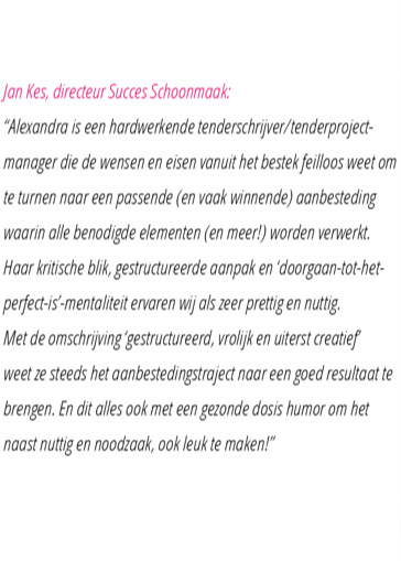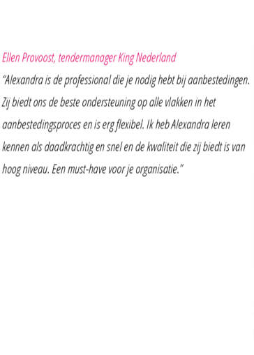 ‘Alexandra is een hardwerkende tenderschrijver/ tenderprojectmanager die de wensen en eisen vanuit het bestek feilloos weet om te turnen naar een passende (en vaak winnende) aanbesteding waarin alle benodigde elementen (en meer!) worden verwerkt. Haar kritische blik, gestructureerde aanpak en ‘doorgaan-tot-het-perfect-is’-mentaliteit ervaren wij als zeer prettig en nuttig. Met de omschrijving ‘gestructureerd, vrolijk en uiterst creatief’ weet ze steeds het aanbestedingstraject naar een goed resultaat te brengen. En dit alles ook met een gezonde dosis humor om het naast nuttig en noodzaak, ook leuk te maken!’